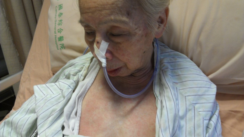老媽舌頭伸長咬到自己 胸前紅疹是抗生素Cefazolin過敏 每天用的灌食針筒標著single use only 藥洗功效顯著 喝紅酒促進循環