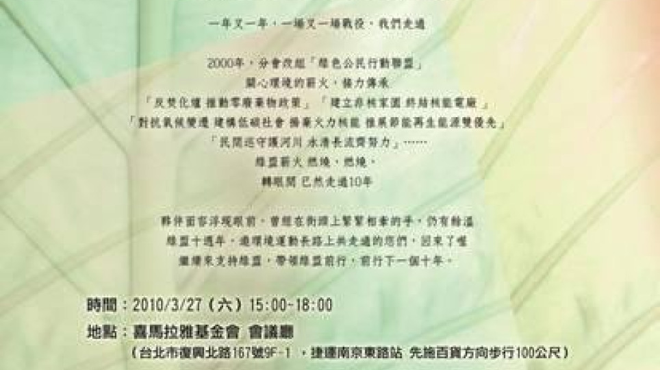 綠盟十周年會員大會 敬邀各位好朋友蒞臨參加 @3/27(本週六)下午三點~六點─轉貼
