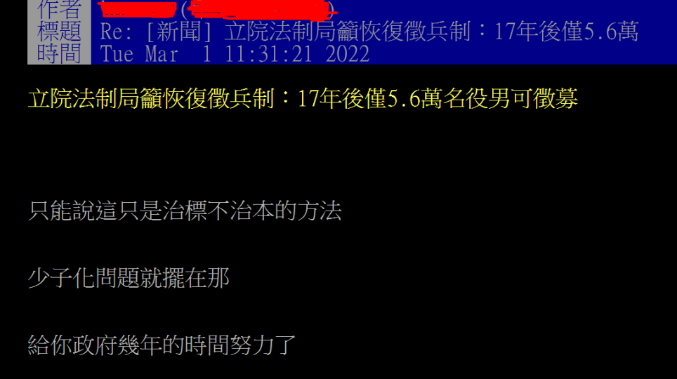 立院法制局報告少子化嚴重損害台灣國防 Ptt網友氣到炸鍋