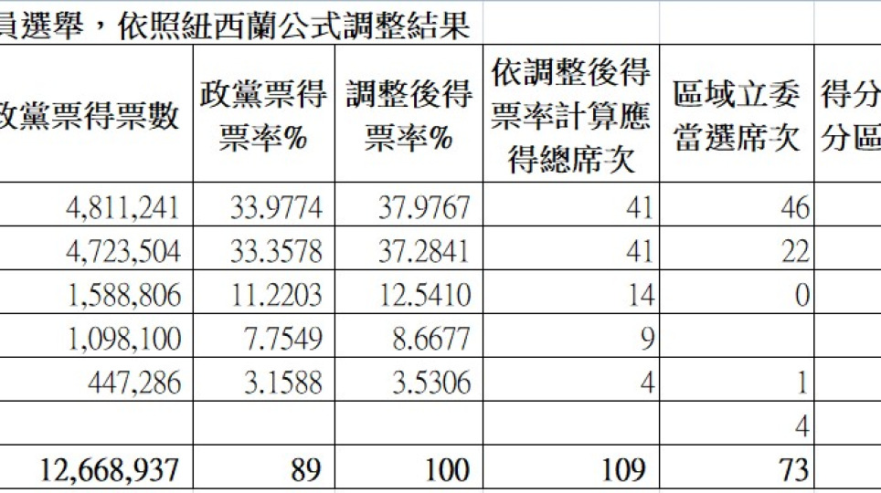 使用紐西蘭公式重新分配臺灣不分區立法委員當選席次