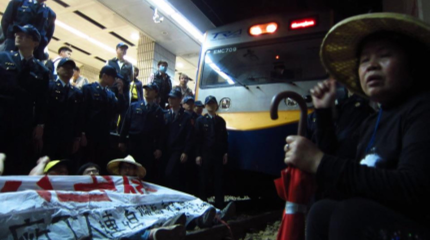 20130205關廠勞工勞委會尾牙丟雞蛋_搭火車的旅客要警察把臥軌勞工拖走_要司機壓死勞工