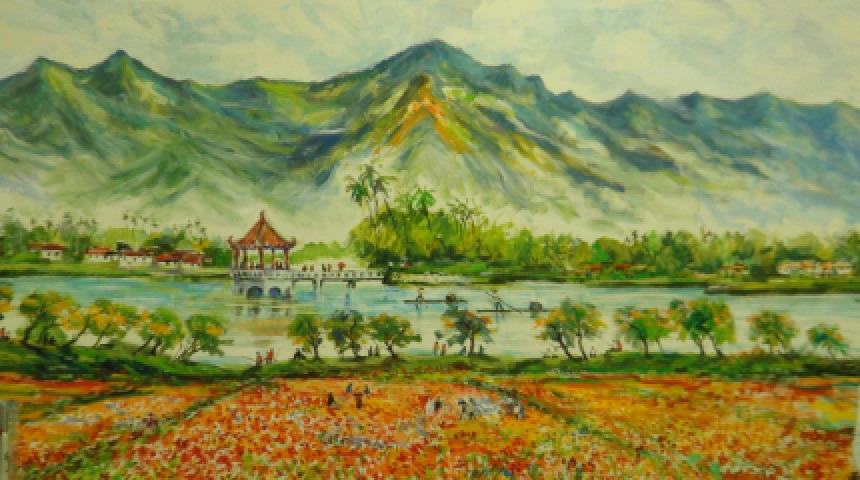 瀰濃放傘橋水圳,稻草借箭台外畫! 相互輝映本土情!彎彎流水人情重!