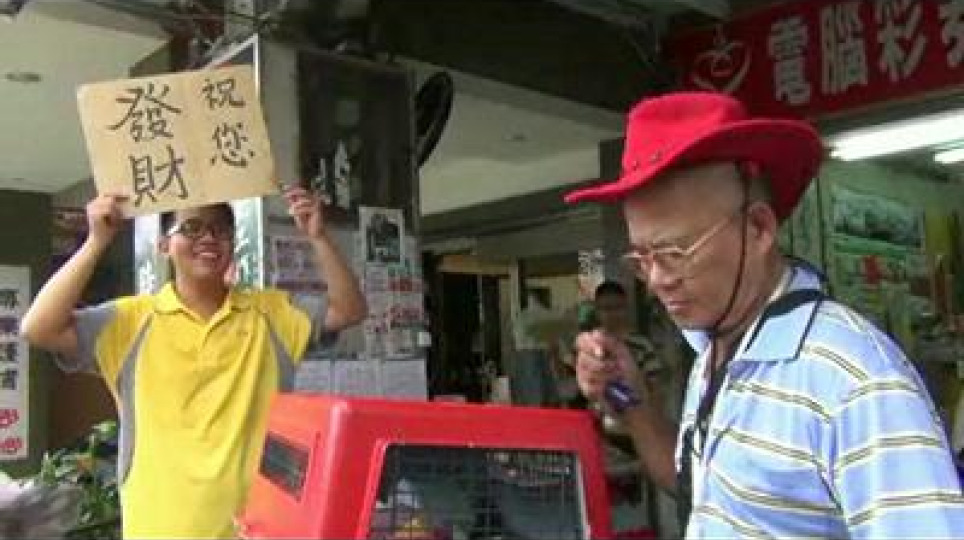 祝您發財!景氣差王博祺突發奇想到隔壁彩券行舉牌祝大家中頭獎2012.07.20