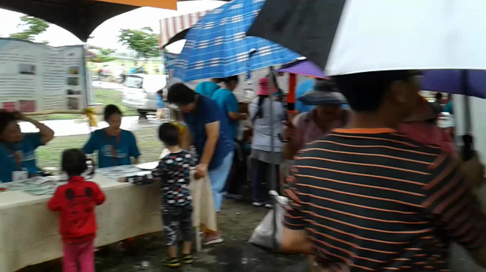 屏東國際風箏節河濱公園攤販今天下著大雨民眾拿著雨傘躲雨